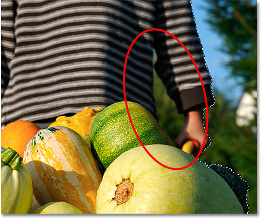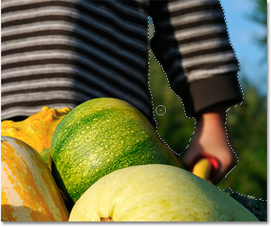 To add to my original selection. I’ll just use the Quick Selection tool to click and drag along the left edge of the sweater. The area I drag over is added to the selection. As long as I keep the cursor inside the sweater and don’t drag over the sky or the trees in the background. only the sweater itself is added: