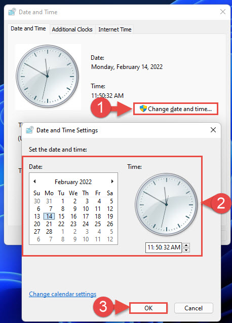 - Now back to the window, click on Change date and time and configure the correct date and time according to your location. Click OK when done.
