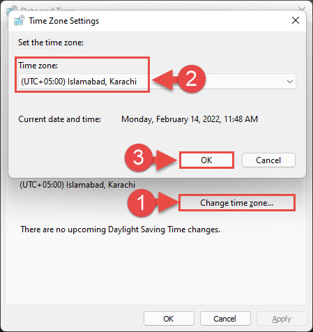 - From that window, click Change time zone, and then select the correct time zone in your region. Click OK when finished.