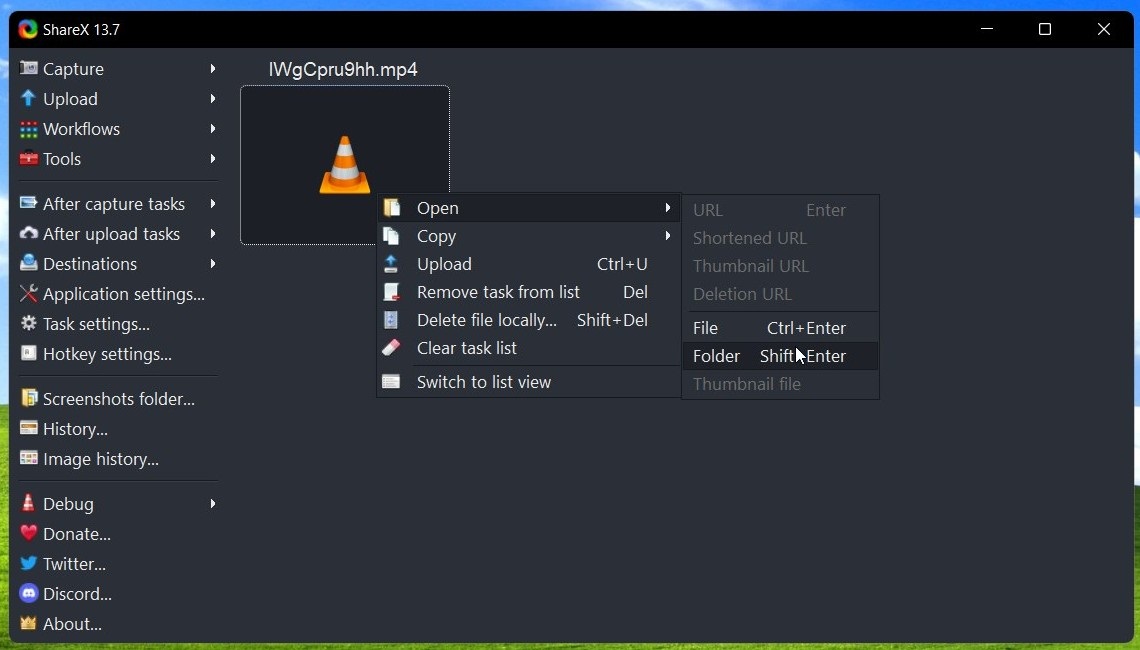 4: Select the video in ShareX to open it or right-click it then click Open > Foler to access the location where the file is saved. Here you can edit, share or rename…