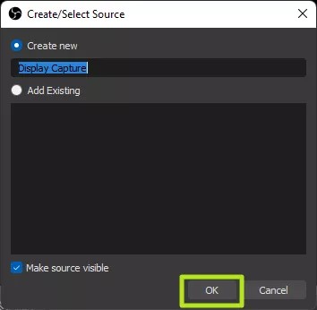 4: You click OK. You can name the content source anything you want instead of Display Capture.