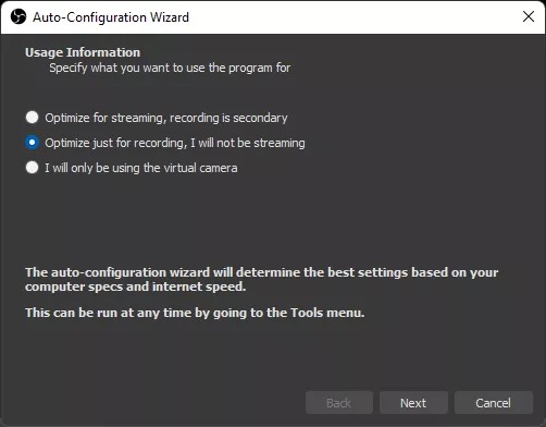 1: You need to download and install OBS Studio . When you run OBS Studio for the first time, you will be given a choice as to what you want to use the tool for. If not streaming, click on the second option to optimize for screen recording.