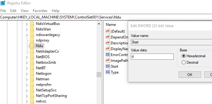 - HKEY_LOCAL_MACHINE > SYSTEM > ControlSet001 > Services > Ndu.