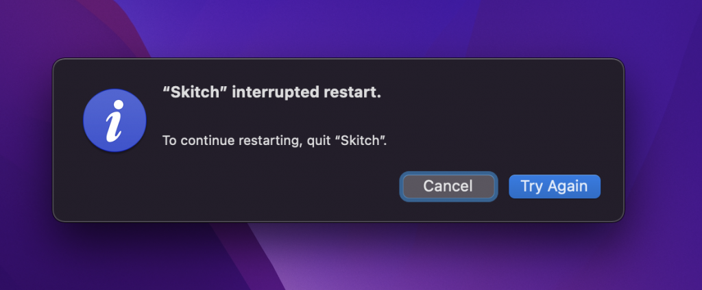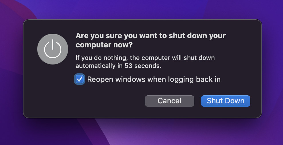 If a program on your MacBook is hanging, shutting down your MacBook will be interrupted. A message will appear asking about “cancel” or “continue” execution of the Shut Down command.